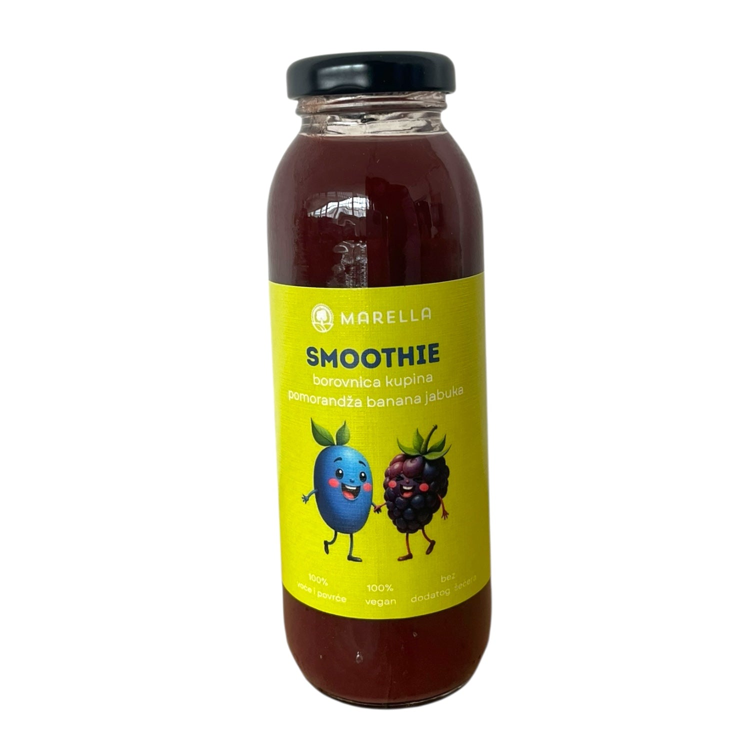 Sastojci: voćni sok od jabuke, kaša od jabuke, kaša od banana, kaša od pomorandži, kaša od borovnica, kaša od kupina.