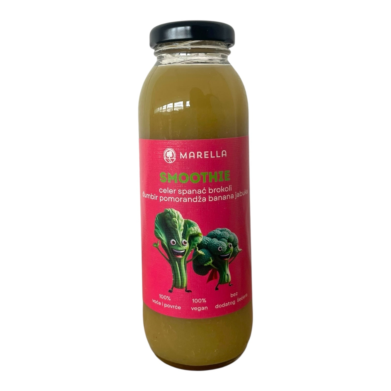 Sastojci: voćni sok od jabuke, kaša od banane, kaša od pomorandže, kaša od spanaća, kaša od celera, kaša brokolia, kaša od đumbira.