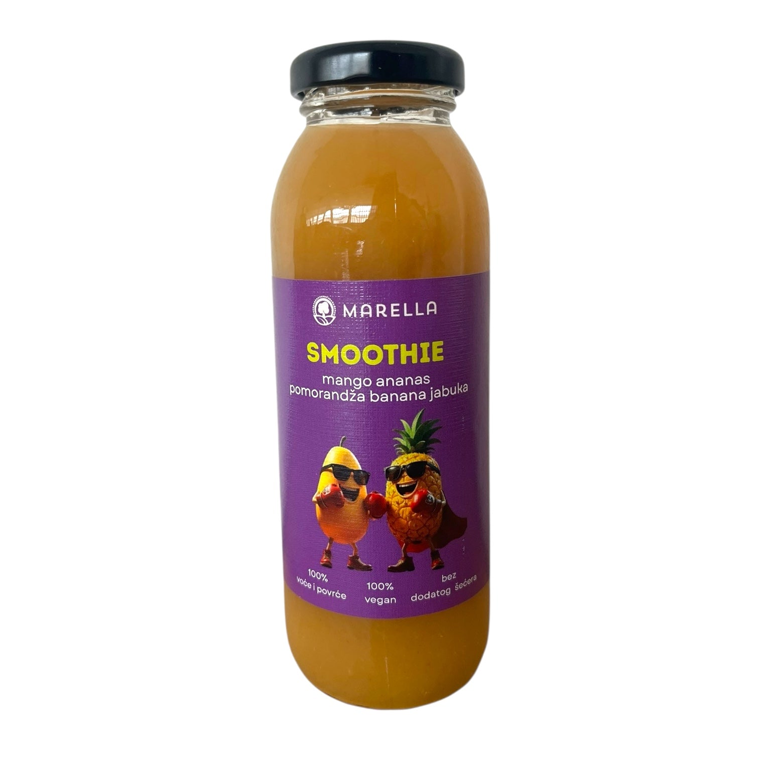 Sastojci: voćni sok od jabuke, kaša od jabuke, kaša od banana, kaša od pomorandži, kaša od ananasa, kaša od manga.